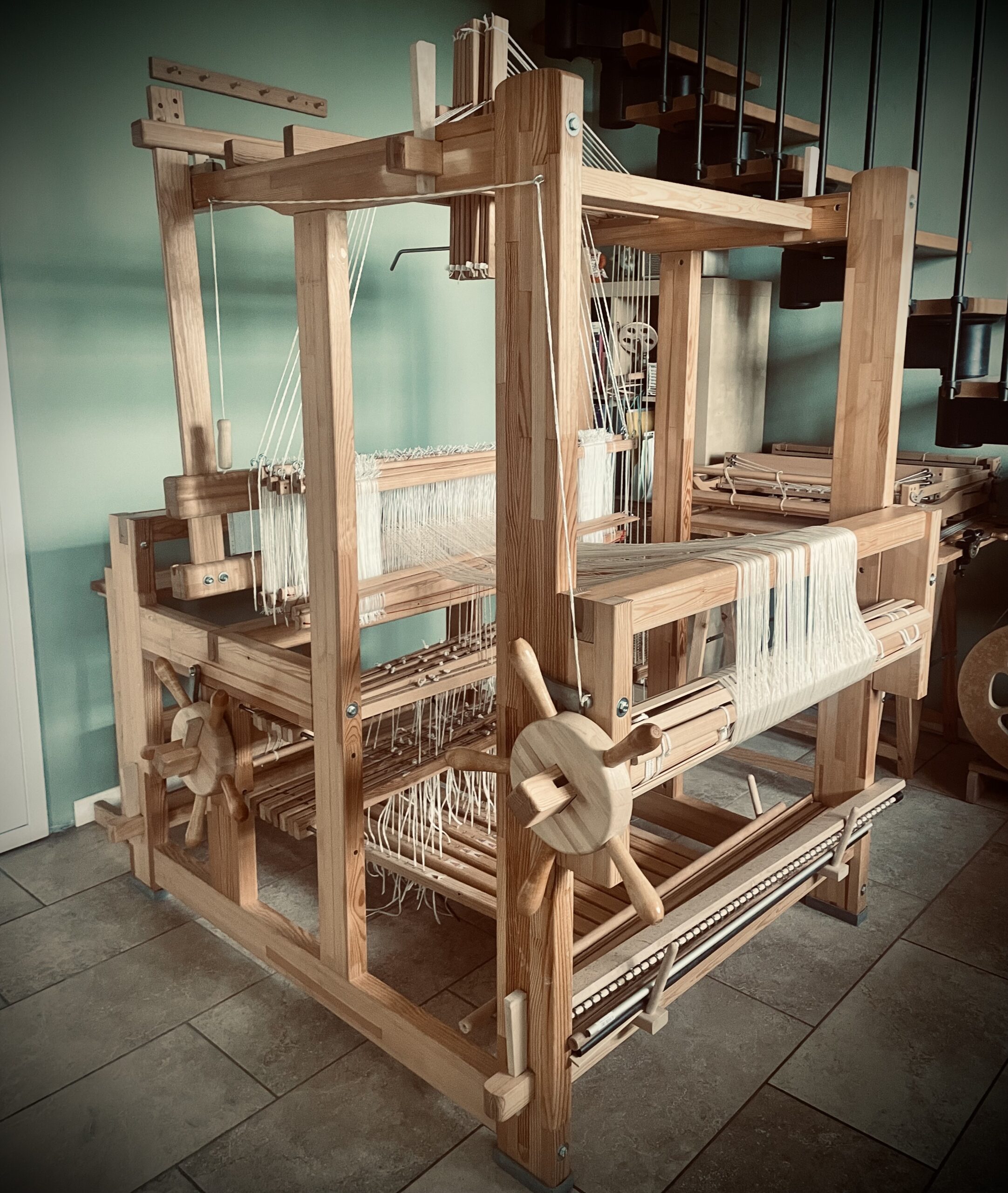 E’ un telaio Glimåkra 8 licci utilizzo fibre pregiate, esclusivamente naturali (lana, alpaca, mohair, cachemire, lino, canapa, cotone).